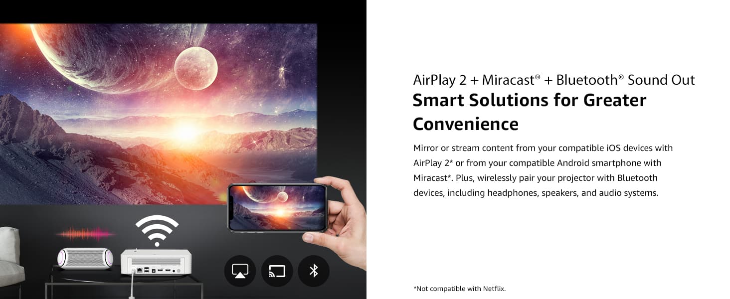 - يوفر ميزة AirPlay 2 وMiracast وDLNA لمشاركة الشاشة مع مختلف الأجهزة الذكية