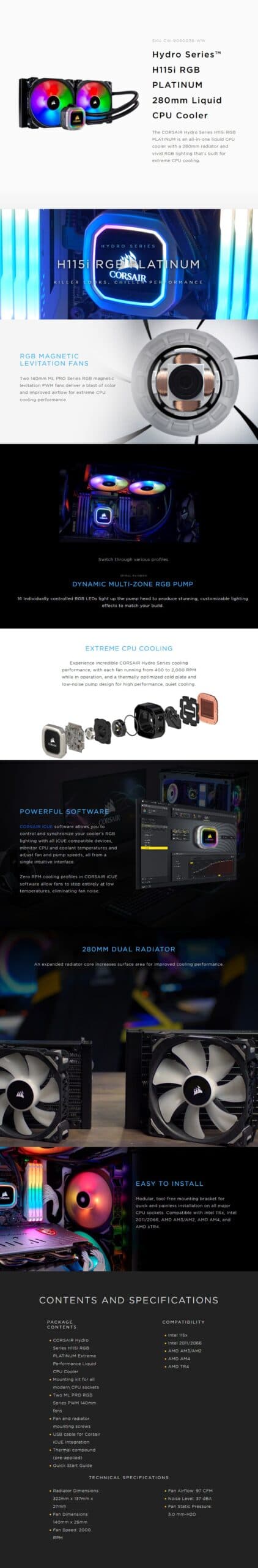 مبرد مائي للمعالج هايدرو سيريس H115i آر جي بي بلاتينيوم 280 مم من كورسير Corsair Hydro Series H115i RGB PLATINUM 280mm Liquid CPU Cooler