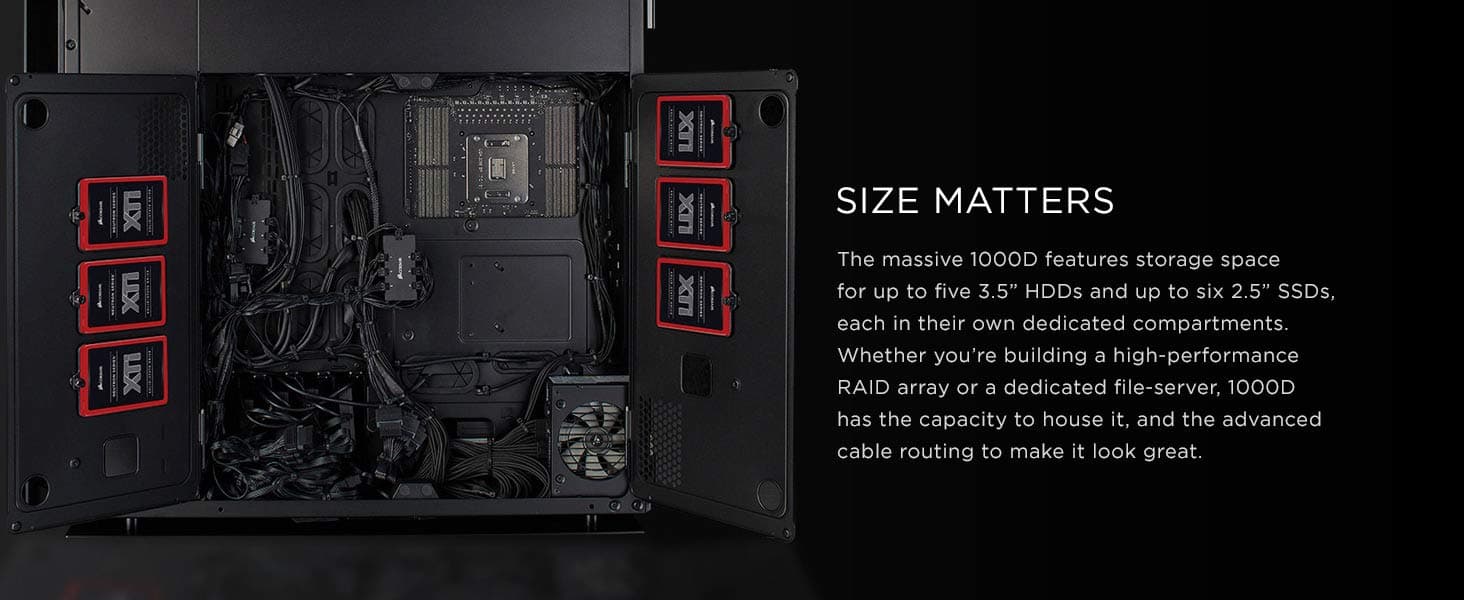 - يتمتع بمساحة واسعة تكفي لتركيب ما يصل ل 18 مروحة تبريد و5 أقراص بحجم 3.5 بوصة و أقراص بحجم 2.6 يصل عددها ل 6 بالإضافة لوجود فتحات توسيعية يصل عددها ل 11
